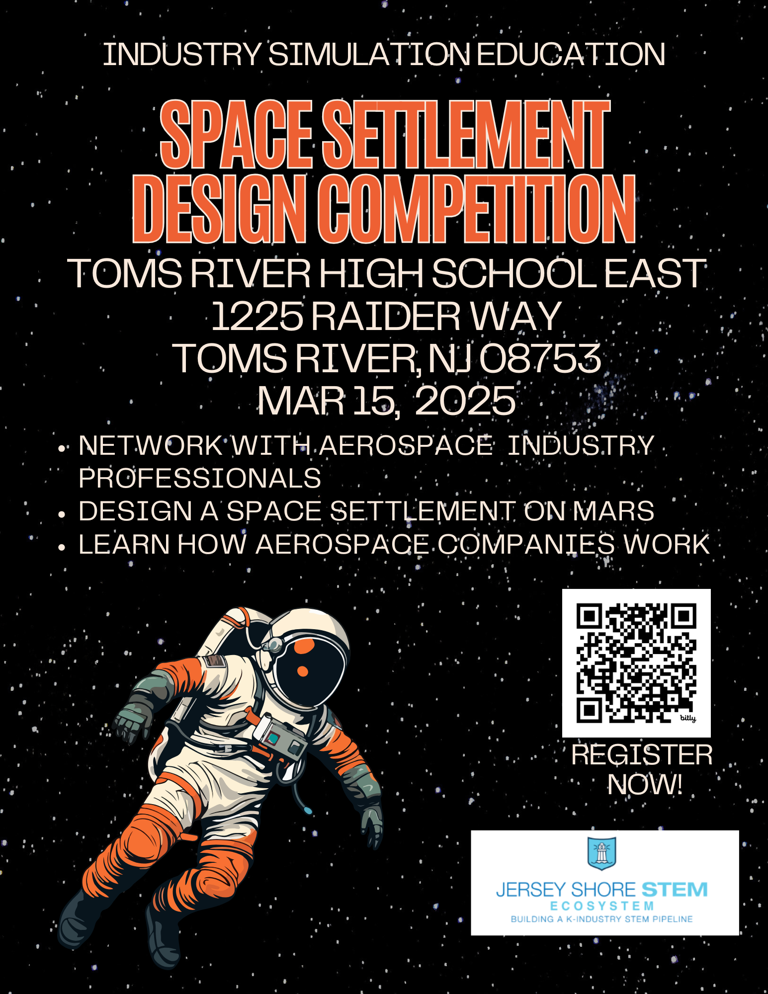 The East Coast Space Design Competition is a high intensity industry simulation event in which students adopt professional roles, are given industry specific challenges, and deliver real world solutions. Industry professionals volunteer their time to support students in designing an entire futuristic space settlement and pitch their design before a panel of industry experts. Winners proceed to the international finals at Kennedy Space Center in July.