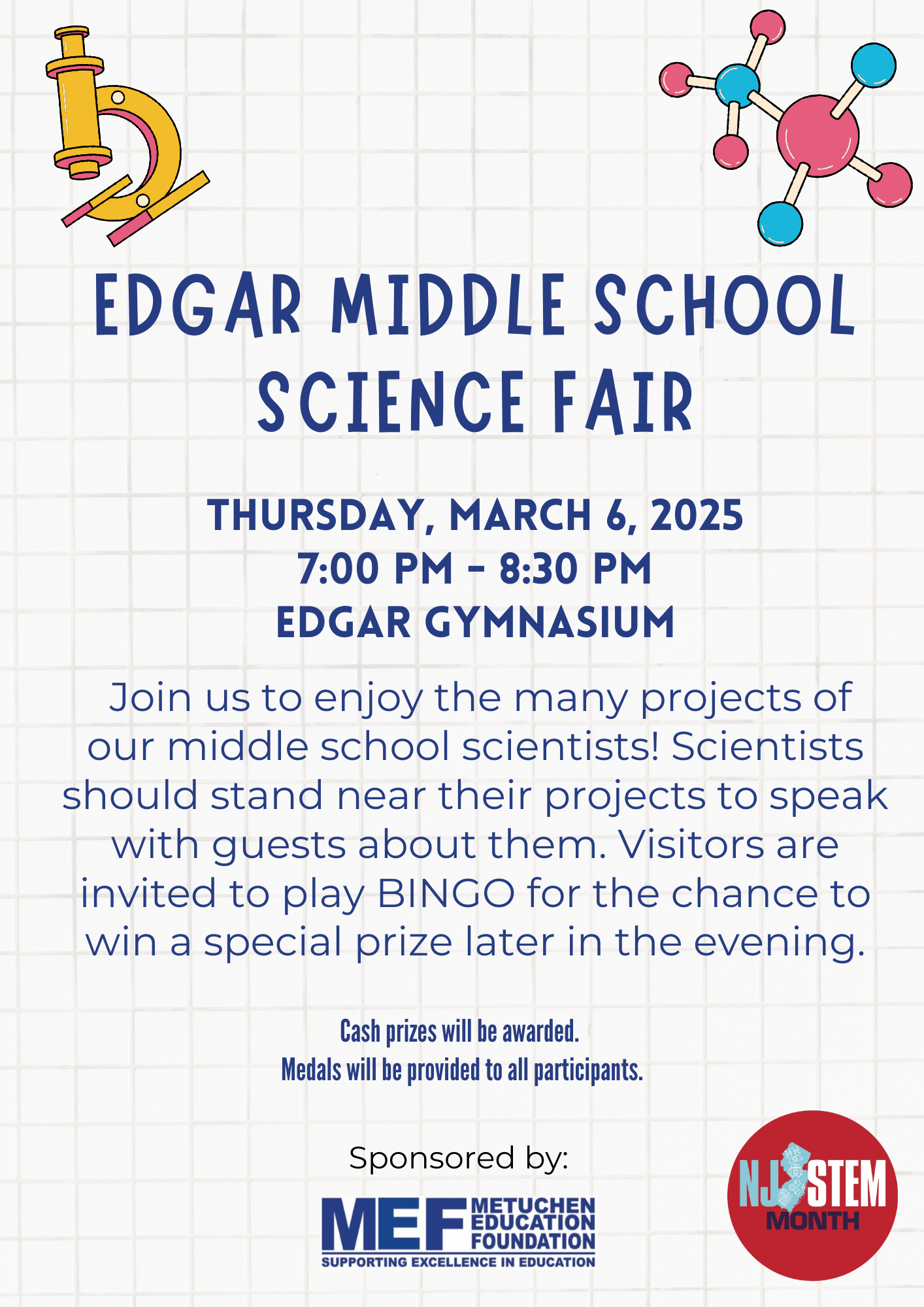Edgar Middle School is hosting a Science Fair on Thursday, March 6th, 2025 for all interested students in grades 5-8. We’ll have over 100 students participating this year! There are cash prizes for the top three students in each grade level and medals given to all students who participate. In addition, we have over 20 judges from our community that come out to judge the science fair. The Science Fair is sponsored by the Metuchen Education Foundation.