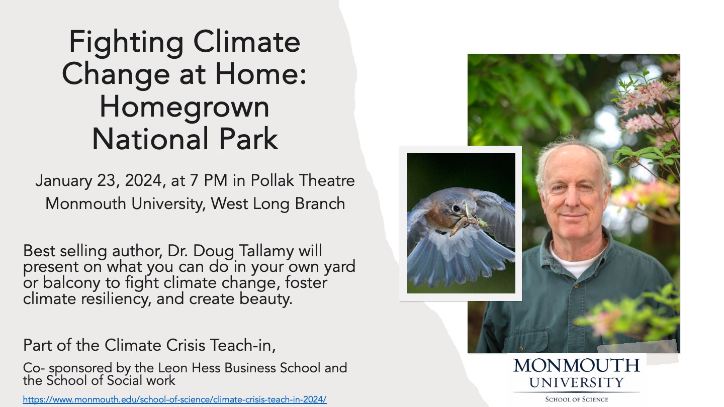 On Tuesday January 23 2024, at 7 PM in Pollak Theater, best selling Author Dr. Doug Tallamy professor of Entomology at University of Delaware and author of Nature’s Best Hope and the Nature of Oaks will present on what you can do in your own yard or balcony to fight climate change, create climate resiliency, and create beauty in your own backyard. Fighting Climate Change at Home: Homegrown National Park will present listeners with a road map on how to fight climate change and create a more ecologically resilient landscape.