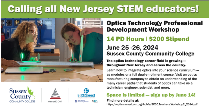 Teachers will learn about the great opportunities available to their students who study optics at Sussex County Community College. Teachers will try out several optics labs using equipment that is inexpensive and user friendly. Attendees will tour the optics labs at SCCC and tour a local optics company. All teachers will receive a stipend for attending.